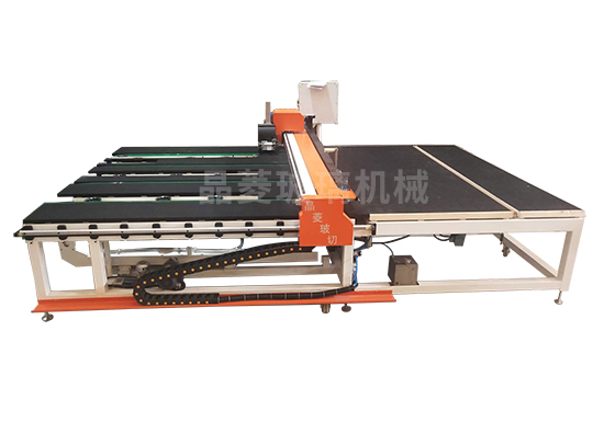 將玻璃放在指定位置,給出(chū)取片信號後,取片吸盤自動翻(fān)起(qǐ)並將(jiāng)玻璃吸附後放置在切(qiē)割台上,切割機(jī)自動校正玻璃定(dìng)位。